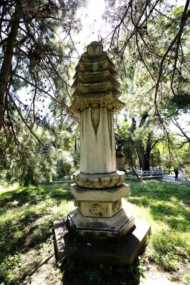 潭柘古剎,歷經(jīng)了十多個(gè)朝代,規(guī)模宏大,曾有難以數(shù)計(jì)的僧人在這里修行,并終老于此,因而在寺院附近留下了數(shù)量眾多的僧人墓塔。如今在寺前的塔林內(nèi)完好的保存著形式多樣的歷代佛塔七十余座。下塔院的塔林埋葬著金、元、明三代的部分高僧,塔形不一,種類較多,有石經(jīng)幢式塔、方形單層浮層屠式塔、密檐式磚塔和覆缽形藏式石塔。塔林中最高大的墓塔要數(shù)金代的廣慧通理禪師塔,此塔位于下塔院的中心,塔高九層,也是密檐式實(shí)心磚塔,塔前設(shè)有寬大的石供桌,塔前左右兩側(cè)還各有一株千年娑羅樹。