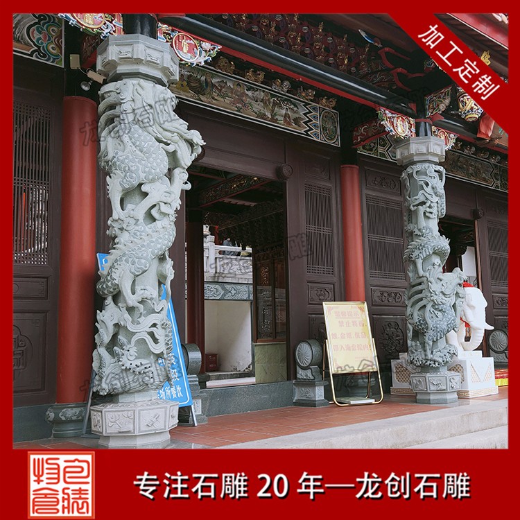 常見寺廟龍柱的制造石材有青石、白石以及其他花崗巖石料,如果雕工要求很復雜的,一般是以青石為原材料,青石的石料單價也要貴很多。做工簡單的,則一般建議用普通的白石即可。普通的白石龍柱會比較便宜,一般三四萬塊就能買到一對合適的3米高龍柱,以浮雕技藝為主。而真正價格較高的龍柱則一般是青石龍柱。龍柱一般有單龍和雙龍之分,雙龍的略貴一些,單龍的便宜一點。龍柱上面除了雕刻龍外,還會雕刻很多其他圖案。中華民族的圖騰是龍圖騰,中國人是龍的傳人,所以龍柱是無論什么國內宗教場所、公眾場所都會擺立的。