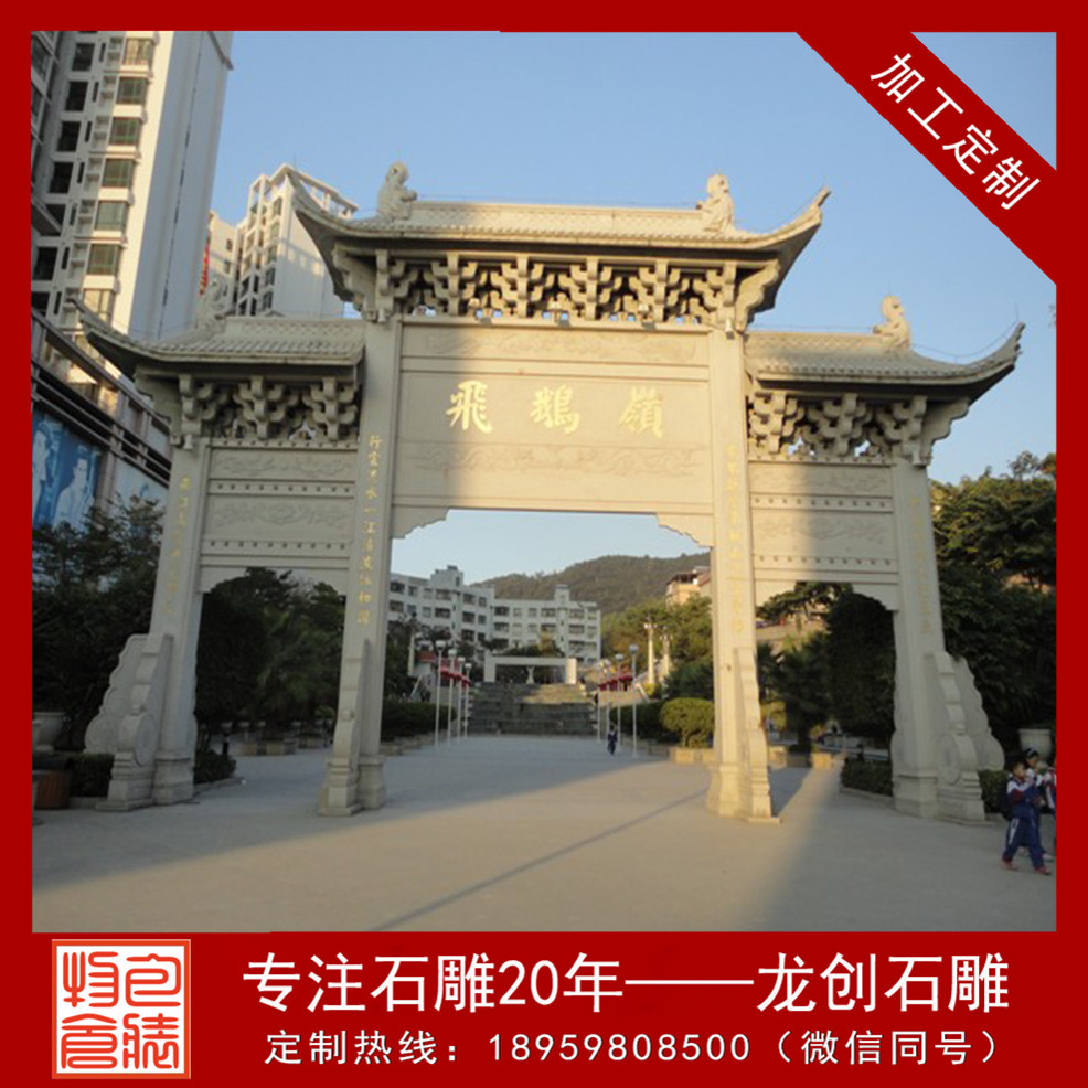 新農村石雕牌坊選擇最多的是三門形式,由四根柱子,中間門大一點,兩側是小門,正反兩面花紋一般都是相同的。上面有牌匾,可以雕刻上文字,中間兩根柱子上也可以雕刻對聯等文字或者其他圖案。