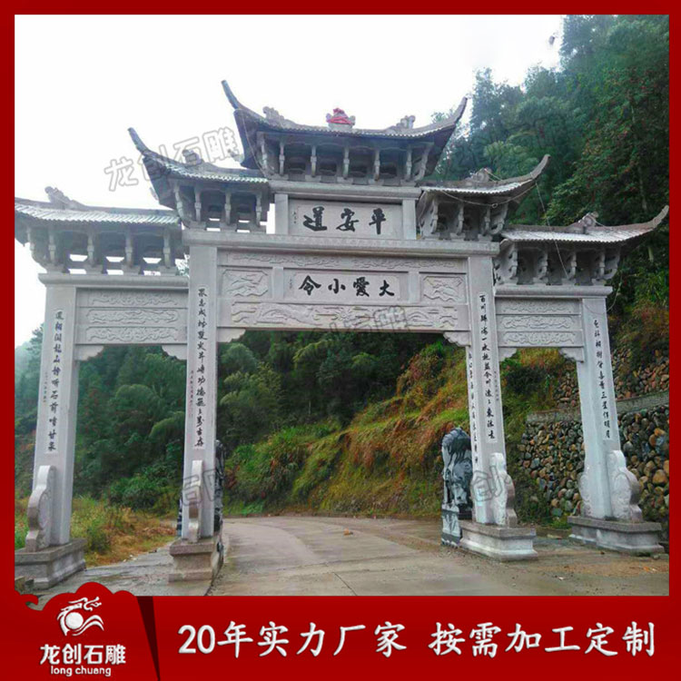 村口牌坊牌樓作為提升農(nóng)村形象的重要建筑物,在選擇上要綜合考慮,農(nóng)村修建村口門樓一般以簡單大方為主,而村口門樓分為有樓的和沒樓的兩種樣式,門數(shù)又分為一門石牌樓、三門石牌樓、五門石牌樓等。村口門樓一般一門一樓三樓或三門三樓五樓七樓較為常見,五門的很少見。石牌樓常見的這幾種樣式也是農(nóng)村人都非常喜歡的,原因一簡單大方,原因二價格實(shí)惠,這兩點(diǎn)很重要。
