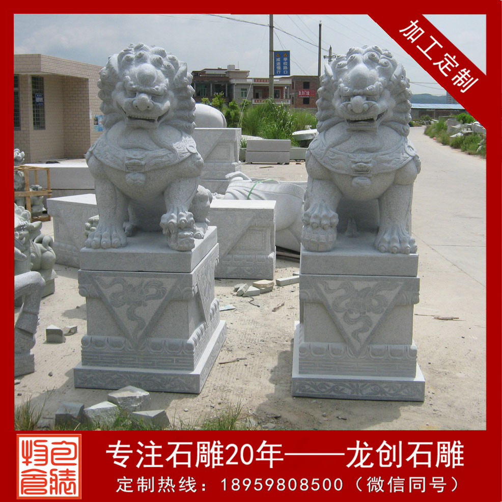 石獅子的造型一般尊嚴而又大氣,是皇jia守衛門戶確保皇宮安寧的瑞獸,因為獅子是獸中zhi王,它體態壯碩雄健、威錳無比、氣勢非常。統治者認為獅子不但可以避邪,還可帶來祥瑞之氣。石雕北京獅為雌雄一對,獅頭飾鬃髦,頸懸響鈴,肌肉發達,氣勢雄偉。雌獅前左腳下有一幼獅仰臥作嬉戲狀,雄獅前右腳撫踩一繡球。底座有繁縟精致的卷葉紋。石雕北京獅瑞獸一種,百獸zhi王,勇不可擋,威震四方,不但可以避邪,且可帶來祥瑞之氣,能解除多種形煞,亦加強官威或屋主之陽氣,如果窗口見到不利之沖克,如沖煞、天斬煞等,可放一對石獅面向口可化煞,且有生權之意,適合官職人員擺放,古時衙門前就是擺放獅子鎮守。
