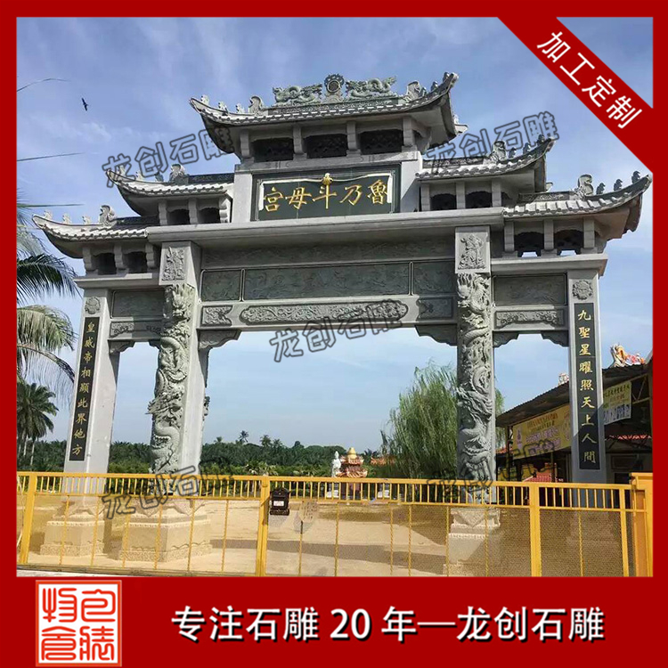 牌坊上經常看到浮雕龍在中國的傳統(tǒng)文化中是吉祥的象征,龍在云中翱翔,將優(yōu)美的姿態(tài)展現給世人看,線條流暢;寓意龍龍四海,還有石獅子抱鼓石有鎮(zhèn)宅等作用,花鳥、圖案、龍鳳及各種瑞獸等都有祥瑞之意,修建這樣的石雕牌坊大門,更能令村莊吉祥如意。龍創(chuàng)石雕專注牌坊制作20年,堅守工匠本心,將每一座牌坊制作都追求優(yōu)質。